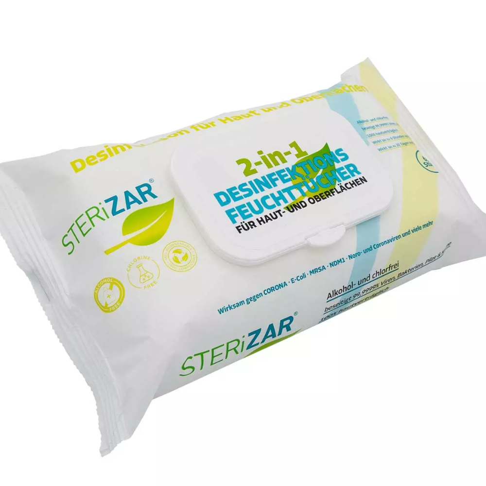 Unsere praktischen STERiZAR-Feuchttücher sind der ideale Begleiter für Unterwegs. Sie entfernen zuverlässig 99,9999% der Bakterien, Viren (auch Corona), Keime und Pilze auf der Haut sowie Oberflächen und entfalten ihre Wirkung innerhalb von nur 30 Sekunden.